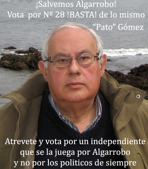 Boris Colja, candidato Nº 3 a alcalde y Pato Gómez candidato Nº 28 a concejal, 100% independientes, invitan a todos los algarrobinos, hombres y mujeres adultos y jóvenes, al gran evento cívico que se realizará en nuestra Comuna el domingo 28 de octubre en que tendrán la oportunidad de ponerle nota a los candidatos que se repiten y a los nuevos que se postulan por un mejor Algarrobo en crecimiento y desarrollo para todos. Es una invitación abierta y gratuita. No dejes de asistir, haz valer tu derecho ciudadano y vota en secreto por tu dignidad en forma informada y no a ciegas, ni con temor o en pago de favores.